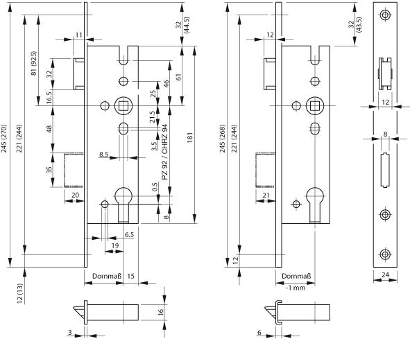 PZ-gelocht Entfernung: 92 mm Drückernuss: 8 mm Stulpausführung: 245 x 3 mm, kantig Mit Wechsel Schlossriegel: 1 tourig Fallenausschluss: 11 mm Riegelausschluss: 20 mm