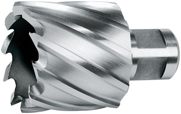 Ausführung: Schnitttiefe bis 30 mm, mit Weldonschaft-Ø 19 mm, CBN-geschliffen, rechtsschneidend. Anwendung: Einsetzbar in Magnetständer- und Säulenbohrmaschinen mit MK-Aufnahme. Der Kernbohrer zerspant nur einen dünnen Materialring. Der stehen gebliebene Bohrkern wird über einen Führungs- und Auswerfstift durch Federkraft ausgestoßen. Die Späne werden schnell nach oben abgeführt und die Bruchgefahr minimiert. Selbst große Bohrdurchmesser benötigen nur relativ wenig Energie. Der Kernbohrer zerspant im Vergleich zum Spiralbohrer nur einen kleinen Teil der Gesamtfläche. Daraus resultiert eine sehr große Kraft- und Zeitersparnis.