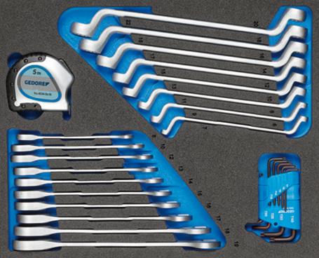Doppelmaulschlüssel Ausführung: DIN 3110, ISO 3318. Aus GEDORE Vanadium Stahl 31CrV3, matt verchromt, Maulstellung 15°, mit flachen Köpfen und griffigem, ovalem Schaft. * Nicht genormte Größe.