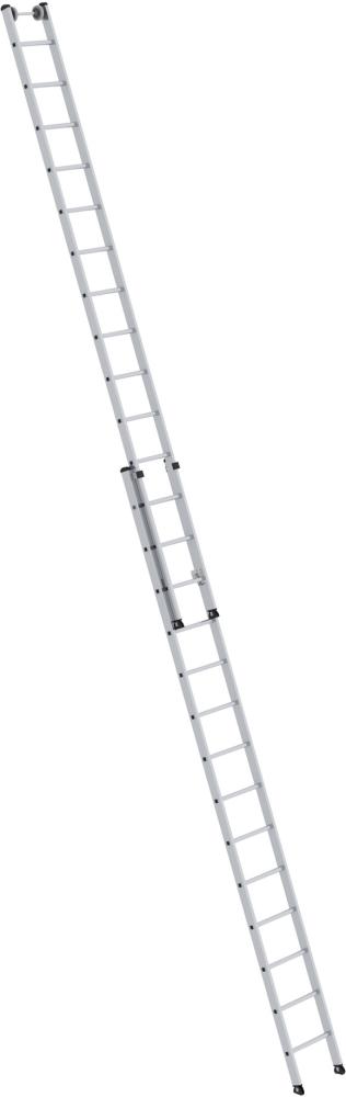 Aluminium-Schiebeleiter, 2-teilig Besonders standsicherDurch nivello®-Leiterschuhe, stabile Rechteckholme, korrosionsbeständige Führungsbeschläge, dauerhaft verbördelte, geriffelte Vierkantsprossen (30x30 mm) und Steckhaken mit automatisch einrastender Abhebesicherung. Sprossenweise höhenverstellbarOberleiter per Hand von Sprosse zu Sprosse verstellbar.Verstellung über integriertes Kunststoffseil. Flexibel einsetzbarBeide Leiterteile auch einzeln als Anlegeleiter verwendbar, ab 2x14 Sprossen mit Oberleiter inkl. Wandlaufrollen. IndustrieausführungBauart-geprüft, entspricht DIN EN 131, BetrSichV, TRBS 2121, DGUV Information 208-016 bzw. 208-017 und geltendem DGUV Regelwerk.