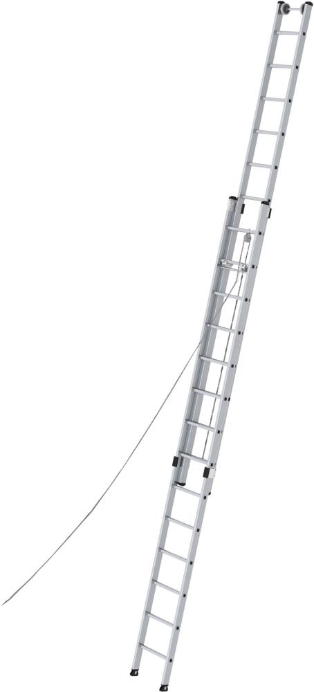 Aluminium-Seilzugleiter, 2-teilig Besonders standsicherDurch nivello®-Leiterschuhe, stabile Rechteckholme, korrosionsbeständige Beschläge mit Gleitführung, dauerhaft verbördelte, geriffelte Vierkantsprossen (30x30 mm) und Steckhaken mit automatisch einrastender Abhebesicherung. Sprossenweise höhenverstellbarVerstellung über integriertes Kunststoffseil. Flexibel einsetzbarBeide Leiterteile auch einzeln als Anlegeleiter verwendbar, Oberleiter mit Höhenverstellung von Sprosse zu Sprosse durch Kunststoffseil. IndustrieausführungBauart-geprüft, entspricht DIN EN 131, BetrSichV, TRBS 2121, DGUV Information 208-016 bzw. 208-017 und geltendem DGUV Regelwerk.
