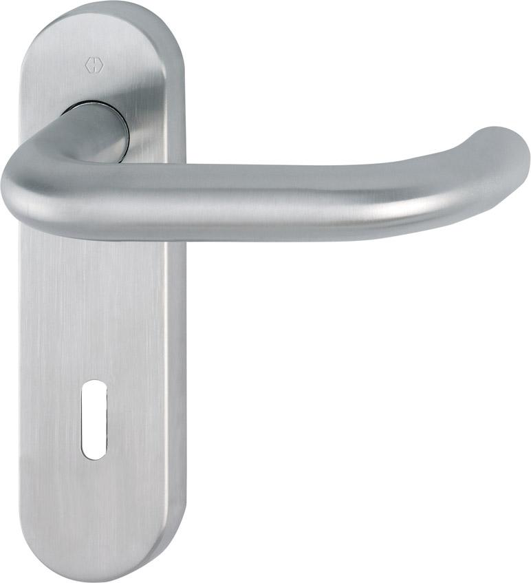 HOPPE-Edelstahl-Innentür-Kurzschild-Garnitur: geprüft nach DIN EN 1906 (Benutzungs-Kategorie 4), Türgriffe für HOPPE-Steckgriff-Verbindung mit Kugel-Arretierung, Schilder mit Stahl-Unterkonstruktion und Stütznocken, wartungsfreies Gleitlager für Türgriffe, aufklippbare Abdeckschilder, verdeckte, lockerungssichere Verschraubung mit durchgehenden Gewindeschrauben.