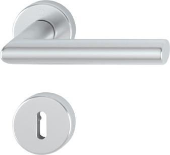 HOPPE-Aluminium-Innentür-Rosetten-Garnitur: geprüft nach DIN EN 1906 (Benutzungs-Kategorie 3), Türgriffe mit HOPPE-Schnellstift-Verbindung (mit HOPPE-Vollstift), Rosetten mit Kunststoff-Unterkonstruktion, Rückholfeder und Stütznocken, verdeckte, durchgehende Verschraubung mit selbstschneidenden Gewindeschrauben.