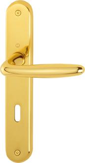 HOPPE-Messing-Innentür-Langschild-Garnitur (Türgriff-Garnitur): Türgriffe fest/drehbar gelagert (mit Rückholfeder), mit HOPPE-Profilstift-Verbindung, Schilder sichtbar verschraubt.