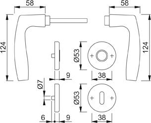 HOPPE-Aluminium-Innentür-Rosetten-Garnitur (Türgriff-Garnitur): geprüft nach DIN EN 1906 (Benutzungs-Kategorie 3), Türgriffe mit HOPPE-Schnellstift-Verbindung (mit HOPPE-Vollstift), Rosetten mit Kunststoff-Unterkonstruktion, Rückholfeder und Stütznocken, verdeckte, durchgehende Verschraubung mit selbstschneidenden Gewindeschrauben.