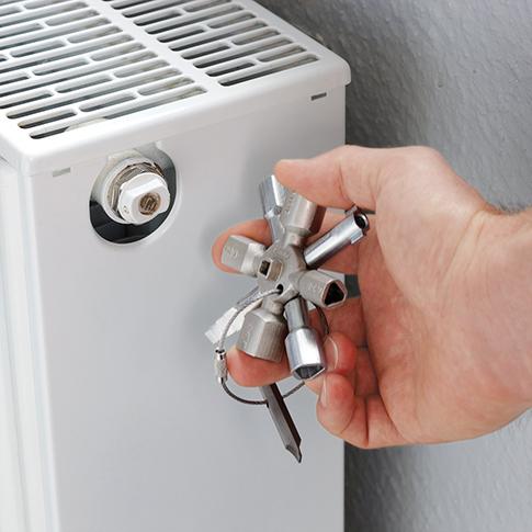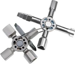 Ausführung: Aus Zink-Druckguss. Bestehend aus zwei Kreuzen, welche mittels Magneten verbunden werden können. Doppelbit Schlitz 1 x 7 mm/Kreuzschlitz PH 2 an einem Edelstahl-Drahtseil. Mit stufenförmigem Innenvierkant 6789 mm, stufenförmigen Außenvierkanten 67 mm; 89 mm und 1011 mm, stufenförmigen Außendreikanten 78 mm; 910 mm und 1112 mm, Doppelbart 35 mm, Halbmond 6 mm sowie Vierkant-Heizkörperventilschlüssel 5 mm.