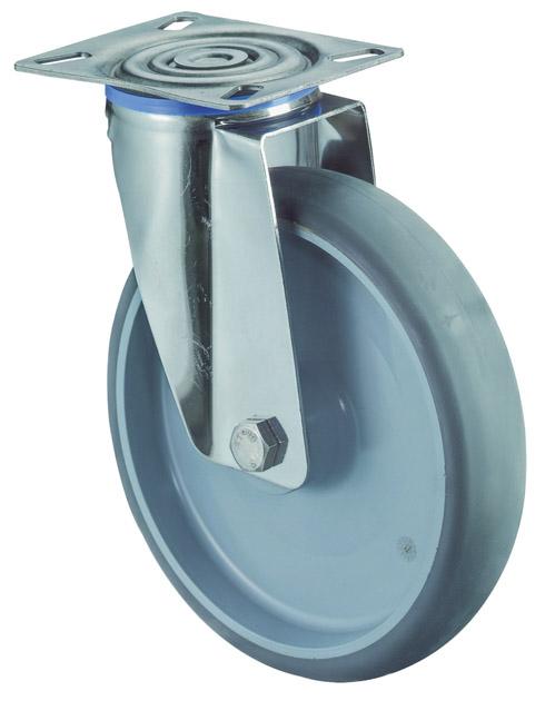 Gehäuse: Edelstahl, zweireihiger Kugelkranz im Gabelkopf Lauffläche: thermoplastisch, Reifen grau Radkörper: Kunststoff Lager: Gleitlager