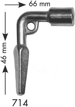 Gekröpft, Temperguss, vernickelt, 8 mm Vierkant-Loch, 710 mm Vierkant-Stift.