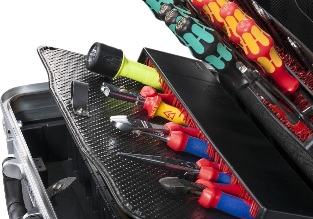 Kofferschale aus X-ABS-Kunststoff, schwarz Verschleißfest und feuchtigkeitsbeständig Verzinkte und arretierte Metallscharniere Aluminium-Doppelrahmen, bis zu 30 kg belastbar Ergonomischer Tragegriff Mit strapazierfähigen Werkzeugtafeln aus Con-Pearl® (Kratzfestigkeit, Formstabilität, Beständigkeit gegen Feuchtigkeit, Fette und Chemikalien) 2 Werkzeugtafeln und 1 Abdeckplatte mit CP-7-Werkzeughaltern 1 Bodenschale, mit Abdeckplatte, 58 mm hoch, frei unterteilbar Dokumentenfach im Deckel Kofferdeckel-Arretierung Standfest mit schützenden, integrierten Bodengleitern 2 Kippzylinderschlösser Lieferung: Ohne Inhalt. Hinweis: Geeignet zur Aufgabe als Fluggepäck.