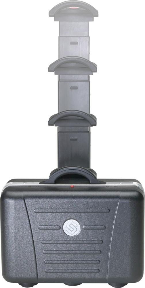 Ausführung: Aus robustem, temperaturbeständigem, kratzfestem und bruchsicherem X-ABS-Kunststoff, schwarz, mit strapazierfähigen Werkzeugtafeln aus Con-Pearl® für Kratzfestigkeit, Formstabilität und Beständigkeit gegen Feuchtigkeit, Fette und Chemikalien sowie stabilem, pulverbeschichtetem 4-fach-Teleskop-Auszug und extrabreiten, gummierten Rollen. Sehr standfest durch breiten Radstand. Mit verzinkten und arretierten Metallscharnieren, Koffer bis zu 40 kg belastbar, Doppelrahmen aus Aluminium. Verschließbar durch 2 Kippzylinderschlösser. Flugtaugliches Modell. Lieferung ohne Inhalt.