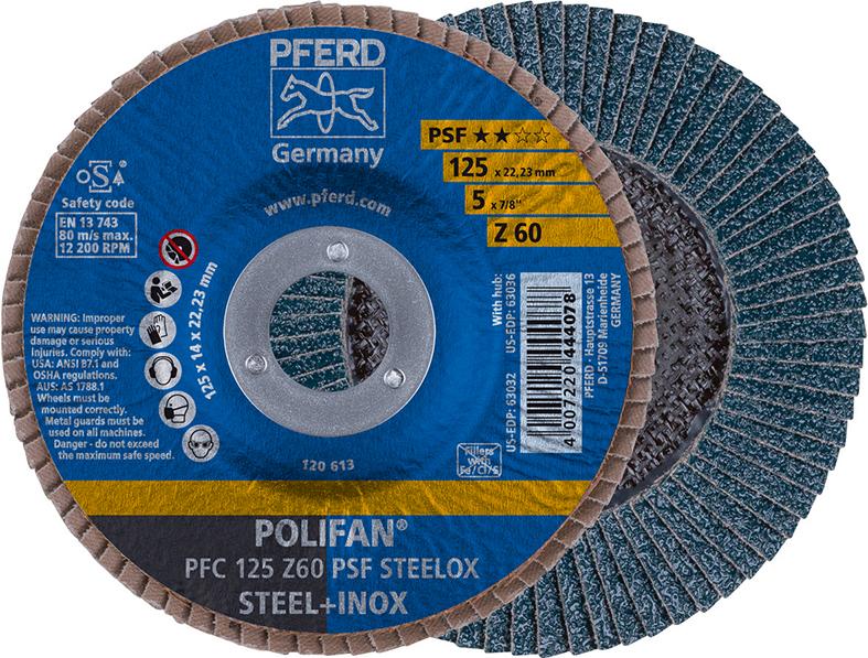 Z PSF STEELOX Ausführung: Zirkonkorund-Lamellen (Z), in Kunstharzbindung hochfest mit dem Glasgewebeteller verbunden. Dadurch aggressive Zerspanungsleistung und gute Standzeit. Ohne Zugabe von eisen-, schwefel- und chlorhaltigen Füllstoffen gefertigt. Normbohrung 22,23 mm. Anwendung: Für die Bearbeitung von Stahl und Edelstahl. Geeignet für Flächenschliff, Schweißnahtbearbeitung, Anfasen und Entgraten.
