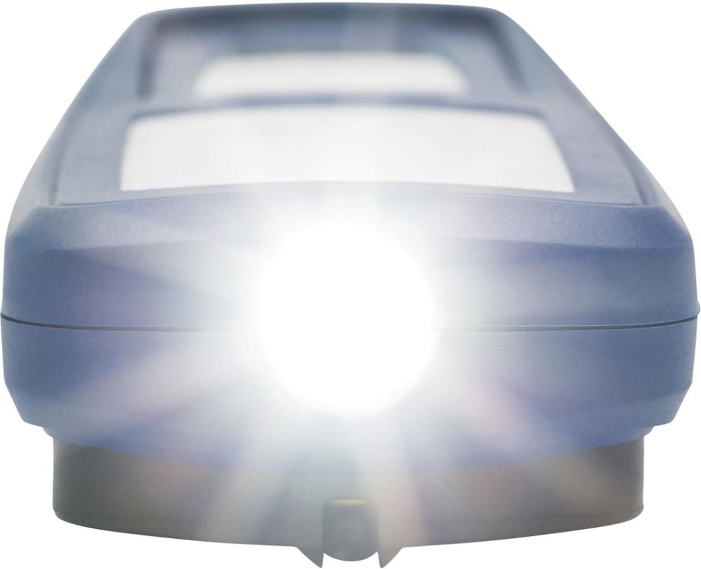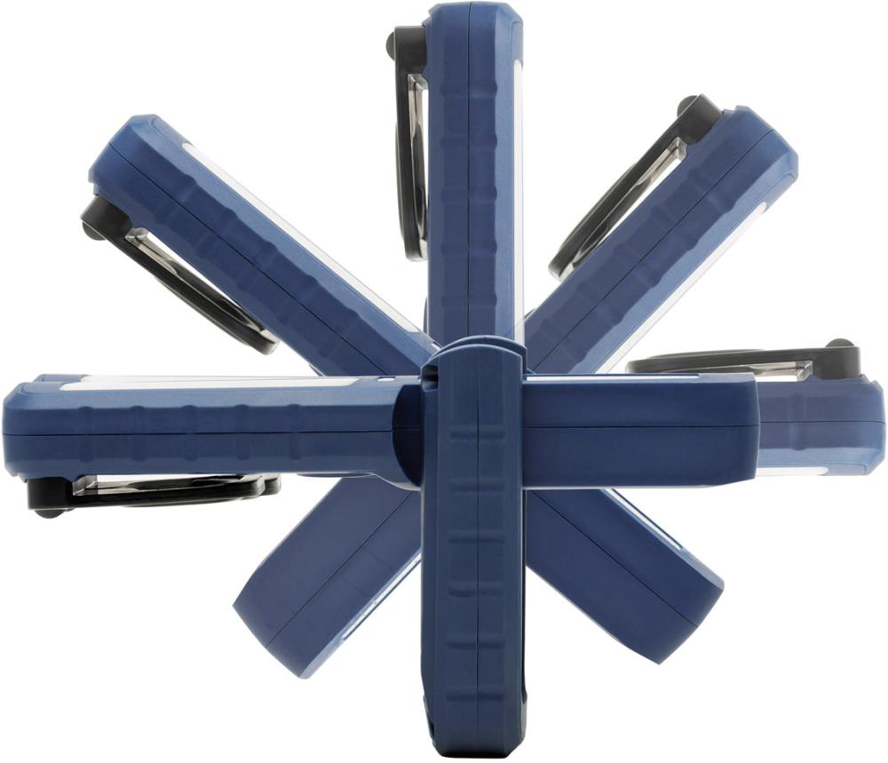 Ausführung: Gehäuse aus Kunststoff mit Gummimantel. Starke, aufladbare COB LED-Arbeitsleuchte für gleichmäßige Ausleuchtung, mit oberem Spotlicht. Der Lampenkopf ist um 180° schwenkbar. Am Lampenrücken ist ein großer Aufhängehaken und ein Magnet für eine optimale Befestigung angebracht. Der Magnetfuß ist schwenkbar. Der Griff hat einen Rahmen, der als Ständer verwendet werden kann. Lieferung mit Li-Ion-Akku 3,7 V/2200 mAh und 230-VAC-Akku-Ladestation.