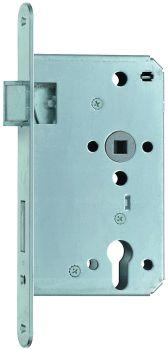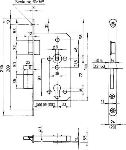 Dornmaß: 65 mm, Entfernung: 72 mm, Nuss: 9 mm, Stulp: 24 mm, rund, verzinkt, Falle und Riegel aus Metall, PZ gelocht, mit Wechsel, ohne Schließblech.