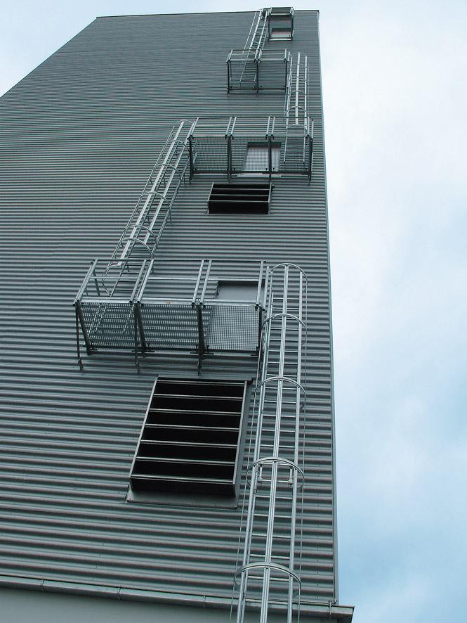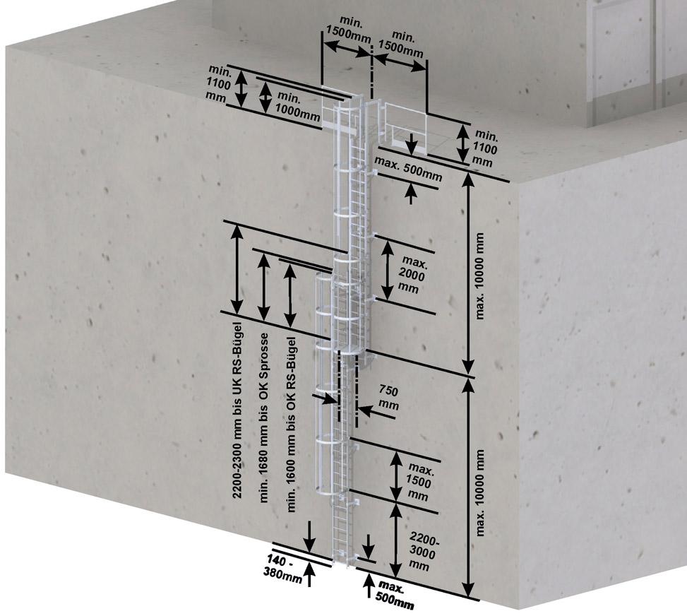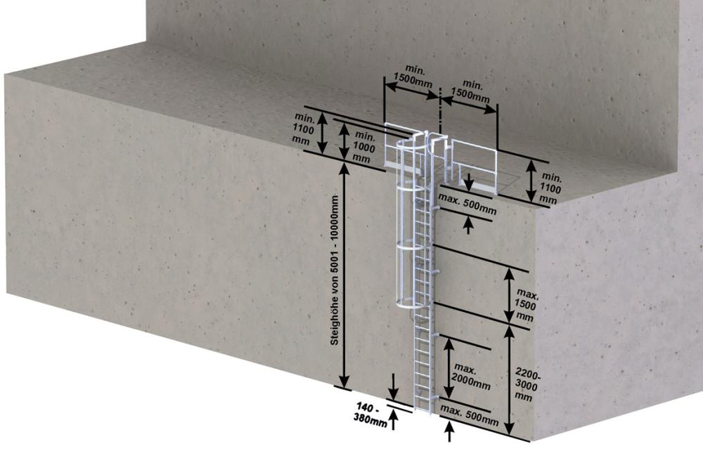Dauerhafter Zugang bei Gebäuden, Anlagen oder Maschinen Steigleitern sind robust, langlebig, effizient und gewährleisten das sichere Besteigen auch über große Höhen. Podeste für festen Stand Optimal geeignet für Ruhepausen und den einfachen Umstieg bei versetzt angebrachten Steigleitern. Umfangreiches Zubehörsortiment für alle baulichen Anforderungen Optimiertes Montagesystem für bis zu 30 % Zeitersparnis. Auf Wunsch vermitteln wir Ihnen die Montage durch Fachbetriebe. Je nach Gegebenheit und Einsatzzweck gelten für die Ausführung von Steigleitern unterschiedliche Normen. DIN 18799-1: Ortsfeste Steigleitern an baulicher Anlage. Geltungsbereich Zur Anbringung an Gebäude für Wartungs- und Reinigungsarbeiten (für Schornsteine gelten besondere Vorschriften). Steigleitern nach DIN 18799-1 umfasst die Tabelle auf der nächsten Seite. Die Höhe der einzelnen Leiternzüge sowie Abstände von Ruhebühnen erfolgt unter Berücksichtigung der Personenkreise 1 und 2. Personenkreis 1 Personen mit Erfahrung in der Benutzung. Personenkreis 2 Personen ohne Erfahrung in der Benutzung. DIN 14094-1: Notleiteranlage. Anwendungsbereiche Notleiteranlagen sind bauliche Anlagen, über die Menschen im Gefahrenfall gerettet werden können. Sie sollten grundsätzlich auch eine Selbstrettung ermöglichen. Bitte senden Sie uns dazu Ihre Anfrage. EN ISO 14122-4: Ortsfeste Steigleiter an maschinellen Anlagen. Viele Einsatzmöglichkeiten Geeignet als Zugang zu stationären und mobilen Maschinen sowie maschinellen Anlagen. Auch zum Einsatz bei Gebäuden oder Teilen einer maschinellen Anlage. Bitte senden Sie uns Ihre Anfrage. Bei Personengruppe (2) = Die maximale Höhe der einzelnen Leiterabschnitte beträgt 6 m. Steigleitern erhalten Sie in 4 Materialausführungen, passend zum Einsatzzweck: Aluminium blank speziell für Innenbereiche. Aluminium farblos eloxiert speziell für ansprechende Optik im Außenbereich. Stahl verzinkt robuste Ausführung für Industrie im Innen- und Außenbereich. Edelstahl V4A (1.4571) wenn es auf Hygiene oder auf Korrosionsbeständigkeit ankommt. Wir beraten Sie gerne bei Ihren speziellen Anforderungen. Jetzt extra montagefreundliche und stabile Ausführung. Bis zu 30 % verkürzte Montagedauer. Mit Rückenschutz (max. Steighöhe bis 10 m): Ab Steighöhe 5 m ist der Rückenschutz im Lieferumfang enthalten. Bei der ersten Ausführung mit Steighöhe bis 4,76 m ist der Rückenschutz NICHT im Lieferumfang enthalten!