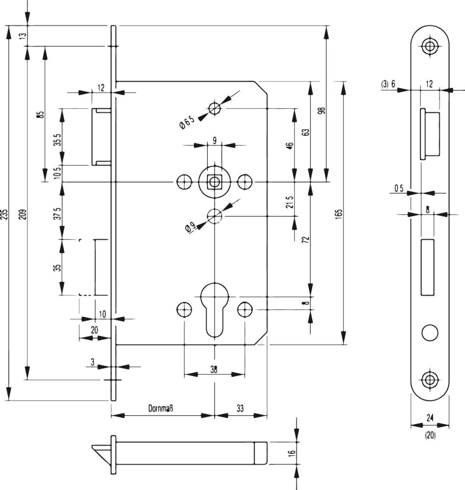 Feuerhemmendes Panik-Einsteckschloss Drückernussvierkant: 9 mm Stulpausführung: rund Stulplänge: 235 mm Mit und ohne Wechsel 2 tourig Funktion Anti Panik: Falle und Riegel aus Stahl, verzinkt Fallenausschluss 12 mm Riegelausschluss: 20 mm Norm: DIN 18250, DIN EN 179, DIN EN 1125