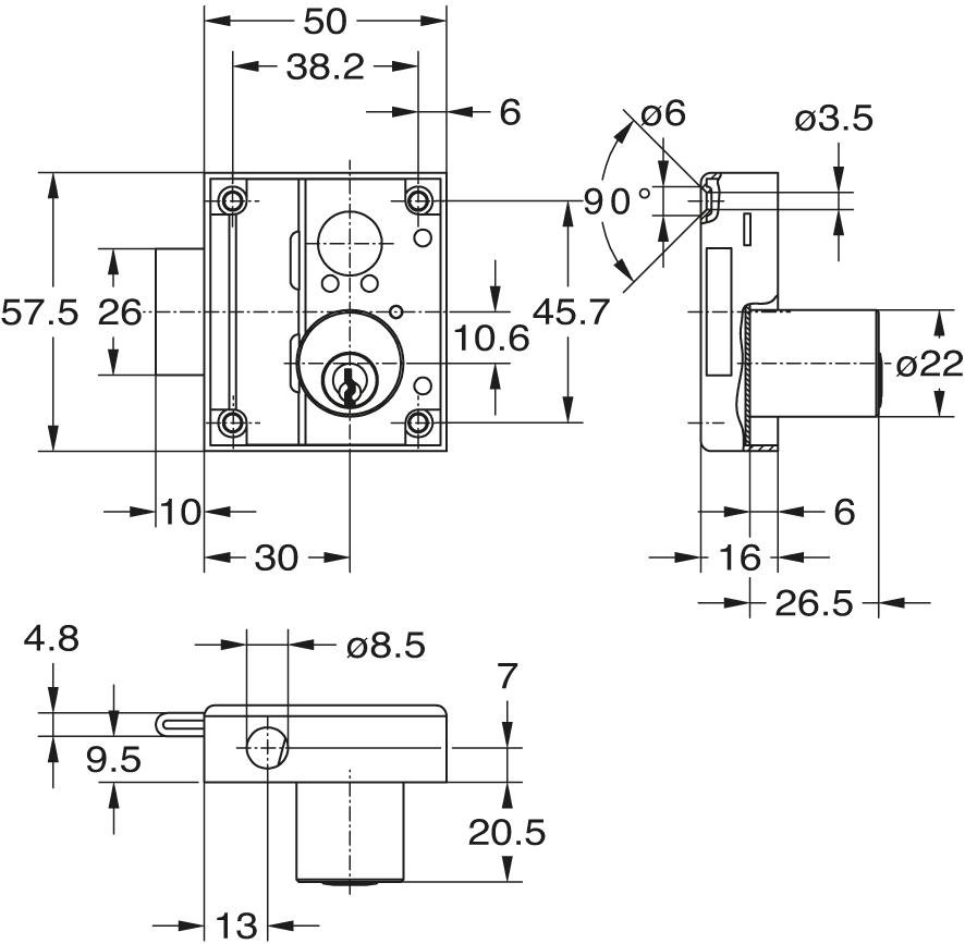 Aufliegend, mit Seitenriegel, mit Zylinder, Kasten Stahl, 2 Schlüssel, 1 Rosette, für Profilstangen Ø 8 mm, komplett mit Zubehör (ohne Stangen). Umstellbar auf DIN links! Dornmaß 30 mm, Richtung rechts.