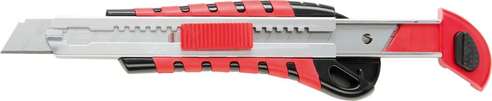 Ausführung: Gehäuse aus Zink-Druckguss mit Gummieinlage, Metall-Klingenführung und Klingendepot mit automatischem Klingennachschub. Fixierung der Klinge durch Drucktaste und zusätzlichem Feststellrad. Lieferung mit 6 Abbrechklingen.