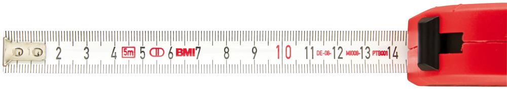 Ausführung: Aus gewölbtem und gehärtetem Federstahl mit mm-Duplex-Teilung, in glasfaserverstärktem Polyamid-Gehäuse. Als Verschleißschutz ist das Band mit Klarlack eingebrannt. Automatischer Bandrücklauf mit Stopptaste, beweglicher Anfangsbeschlag für Innen- und Außenmessung.
