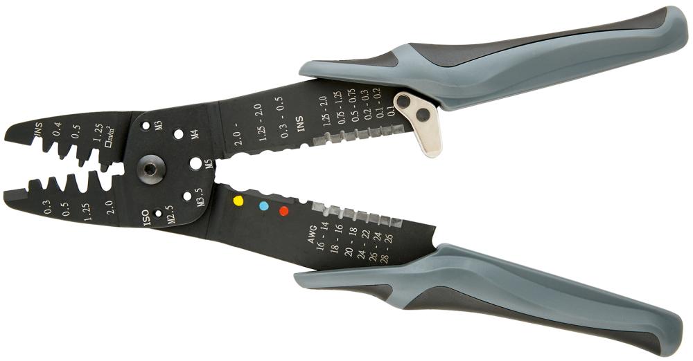 Anwendung: Zum Kabelschneiden und Abisolieren von Drähten und zum Crimpen von Kabelschuhen und Steckverbindern. Mit Abscherfunktion für Schraubbolzen von M2,6 bis M5 und Abisolierfunktion für PVC-Leiter.