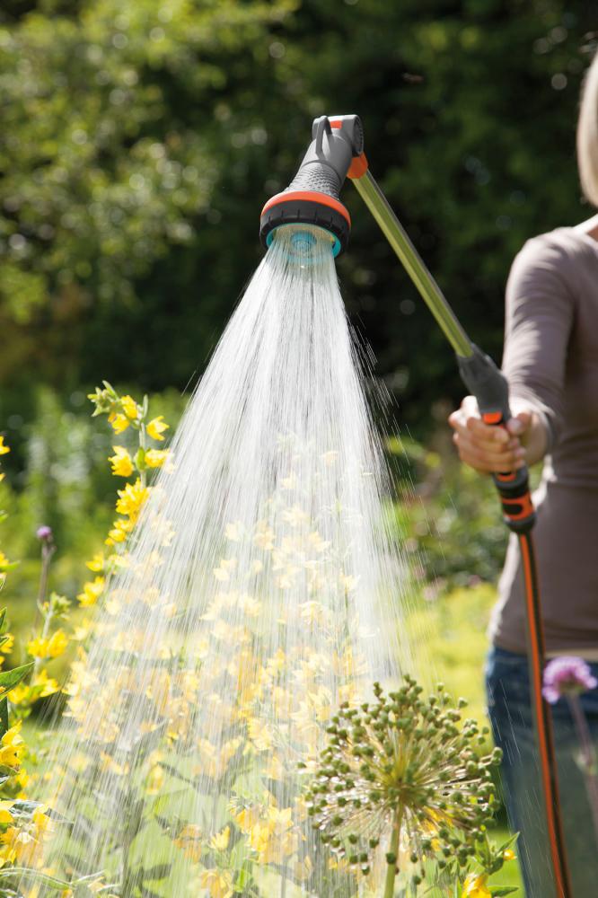 Ermöglicht die Bewässerung entlegener und schwer zugänglicher Stellen Wasserdurchfluss stufenlos regulierbar Verschiedene Sprühbilder Schwenkbarer Gießstabkopf Arretierbare Auslösetaste ermöglicht eine dauerhafte Bewässerung Integrierte Frostschutztechnologie Länge 90 cm Made in Germany