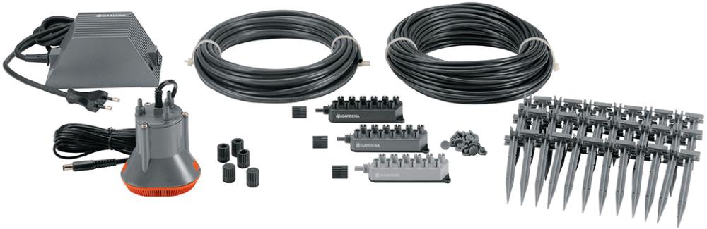 Für bis zu 36 Topfpflanzen. Bewässerung wird täglich für 1 Minute über Transformator mit integriertem Zeitschalter aktiviert. Wasserabgabe pro Verteilerausgang: Hellgrauer Verteiler 15 ml/Min., mittelgrauer Verteiler 30 ml/Min., dunkelgrauer Verteiler 60 ml/Min. Gekapselter Niederspannungstransformator (14 V) zum Einsatz im Innen- und Außenbereich. Schlauchhalter zur Fixierung von bis zu 3 Tropfschläuchen pro Topf. Inhalt: Transformator mit Zeitschalter, Pumpe mit Schmutzfilter, 3 Tropfverteiler à 12 Ausgänge, 9 m Verteilerschlauch, 30 m Tropfschlauch, 36 Schlauchhalter, 20 Verschlusskappen. Made in Germany.