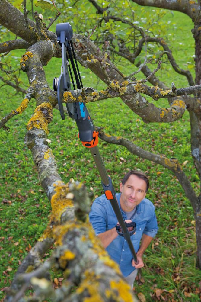 Die GARDENA combisystem-Bypass-Baumschere ist ideal geeignet für das Schneiden von Ästen in hohen Bäumen. In Kombination mit einem GARDENA combisystem-Teleskopstiel können so Äste bequem vom Boden aus ohne Leiter bis in großer Höhe gekürzt werden. Die integrierte doppelte Hebelübersetzung und die dreifache Rollenübersetzung sorgen für eine enorme Kraftersparnis. Damit ist ein müheloses Schneiden von Ästen bis ca. 35 mm Astdurchmesser gewährleistet. Die antihaftbeschichteten Messer garantieren einen sauberen und exakten Schnitt sowie eine leichte Reinigung. Besonders bequem: Mit der Asteinhängung ist noch weniger Kraftaufwand für das Schneiden nötig, und das Zugzeil kann bequem bedient werden. Das Zugseil selbst ist 4,7 m lang und reißfest. Die neuen Combisystem Baumscheren Komfortabel und präzise schneiden ohne viel Kraftaufwand D-Griff für kraftvolles, angenehmes Arbeiten, liegt sicher und fest in der Hand Baumschere kann im Ast eingehängt werden für angenehmes Handling Optimierte Messer-Geometrie Sicherheitsbügel, zusätzliche Fixierung am Teleskopstiel, wenn die Schraube nicht fest angezogen ist Seilaufbewahrung, kein Verheddern beim Arbeiten Griff anpassbar an individuelle Arbeitshöhe Fixierung für das Seilende, kein ungewolltes Abwickeln Dämpfer vermeidet unbeabsichtigtes Einfahren des Teleskopstiels Made in Germany