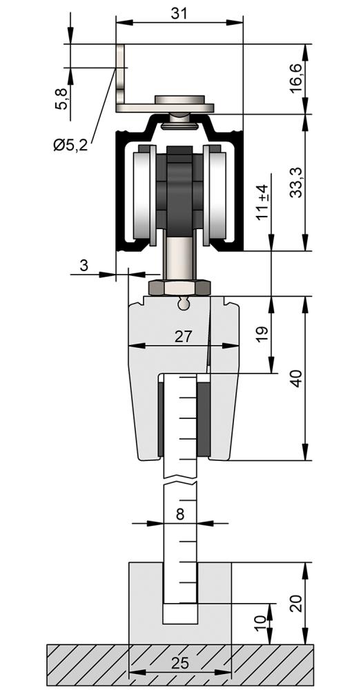 Für einflügelige Glasschiebetüren bis 50 kg Flügelgewicht und Türstärken von 8 mm (ESG)