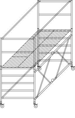 Stückliste 1x Klapprahmeneinheit mit 4 Lenkrollen, Ø 125 mm, mit Feststellbremse 1x Plattform mit Klappe 1x Plattform ohne Klappe 3x Horizontalstrebe 2x Geländerrahmen 1,35 m| Arbeitshöhe bis ca.: | 3,60 m |