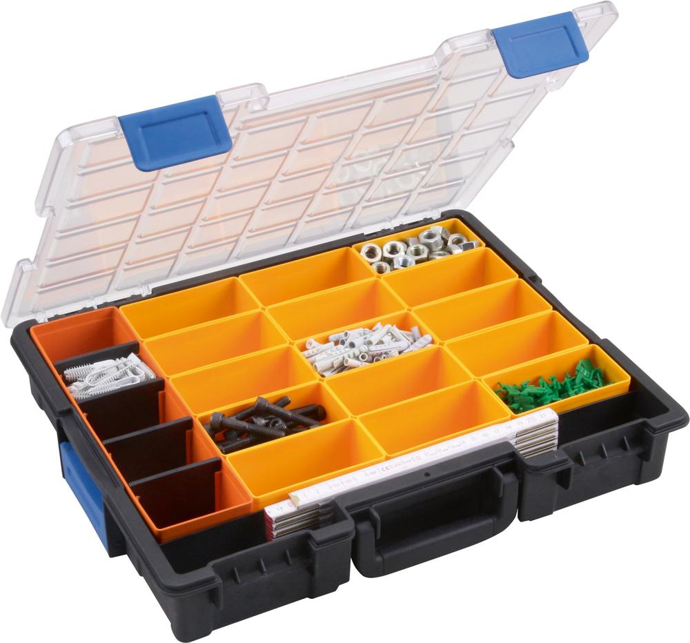 Erweiterbar mit herausnehmbaren Einsatzboxen und/oder Trennstegen Mit Clips Mit transparentem Deckel Fest schließend: keine Durchmischung des Inhalts Verbindungsverschluss ermöglicht den Transport von bis zu 3 Kleinteilekoffern Ergonomischer, abklappbarer Griff