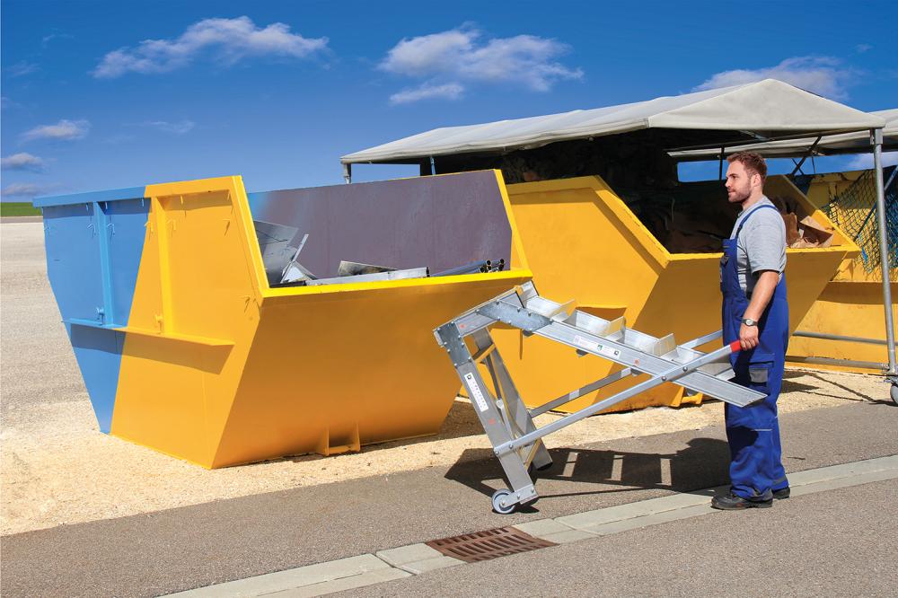 Durch 2 Schiebegriffe und 2 Bockrollen, Ø 125 mm, und rutschfesten Leiterschuhen.