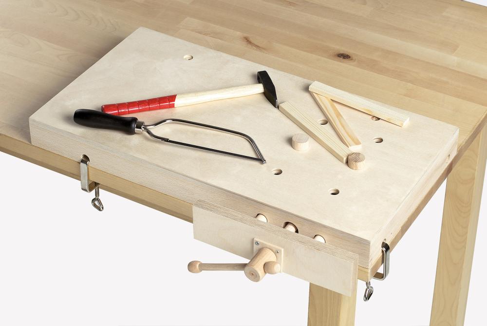 Vollholz, natur Abnehmbare Werkbankplatte als Arbeitsplatte am Tisch nutzbar Höhenverstellbar bis 740 mm Ablagefach mit Hängeeinrichtung für Werkzeuge Lieferung: Ohne Werkzeug.