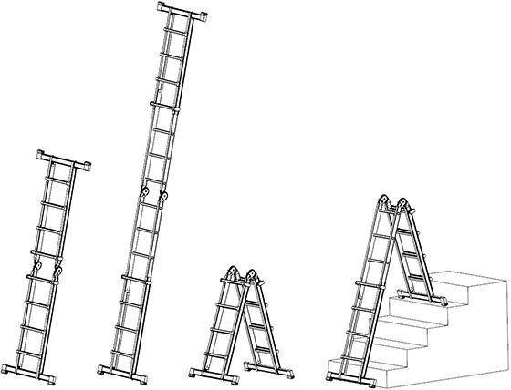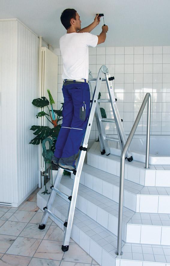 Multifunktional einsatzfähig 4-teilig, treppengängig, durch automatisch verriegelnde Stahlscharniere klappbar, Außenteile ausschiebbar im Abstand von 280 mm. Flexibler Einsatz - bestimmungsgemäße Verwendung. Hohe Standsicherheit Durch die konische Bauweise. Industrieausführung Bauart-geprüft, entspricht DIN EN 131, BetrSichV, TRBS 2121, DGUV Information 208-016 bzw. 208-017 und geltendem DGUV Regelwerk.