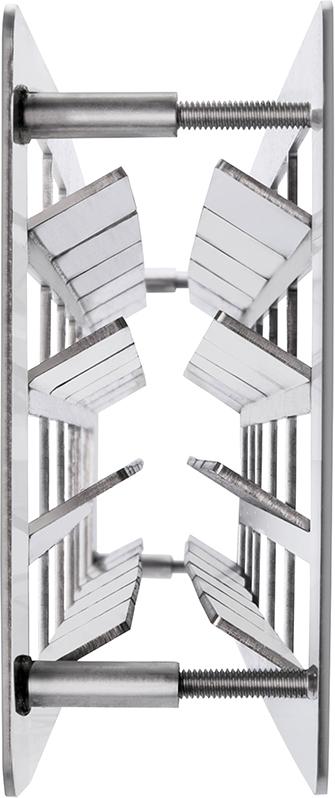 Edelstahl, Türlüftung gebürstet Korn 320; Materialstärke 1,50 mm; mit nach hinten gekanteten Lamellen mit einer Breite von 71 mm; 1 Teil mit 4 Gewindebuchsen, das Gegenstück mit 4 Schraublöchern gebohrt und versenkt. Für Türstärken ab 30 mm, Luftdurchlass: 200 cm².
